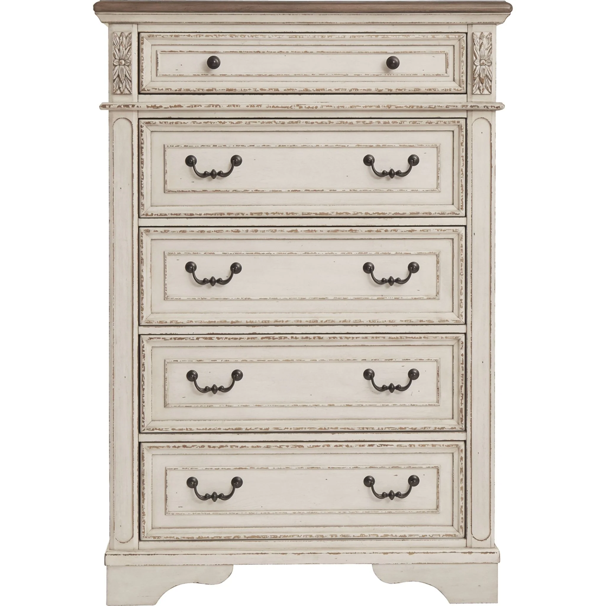 Elevating the art of traditional cottage styling, this chest of drawers is your dream bedroom retreat realized. Antiqued two-tone aesthetic blends a chipped white with a distressed wood finished top for added charm. Framed drawer fronts and decorative corbels add refinement, while bail pulls in a dark bronze-tone finish lend a classic touch.